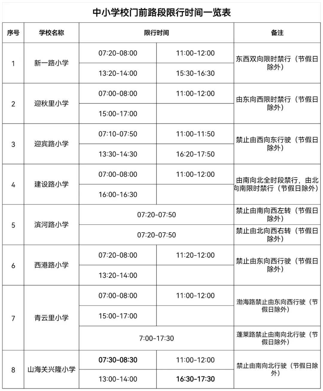 秦皇岛市公安局交通警察支队关于调整部分学校周边道路交通管制时间的通告根据《中华人民共和国道路交通安全法》相关规定,自2022年2月28日起,对新一路等8所学校周边道路交通管制时间进行调整。请广大市民相互告知并合理安排出行时间。具体限行时间及路段见附表。2022年2月25日 附:限行时间一览表