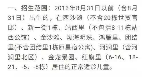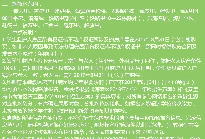 2.继续招收学区范围内学生及其排名前列监护人户籍所在地与房产地址不一致但房产购买时间为一年以上的适龄儿童。其中,排名前列监护人及适龄儿童户籍为山海关区户籍的优先,其次为非山海关区户籍的适龄儿童。2019年入学排名前列监护人购房需一年以上,2020年需2年以上,2021年及以后需三年以上。