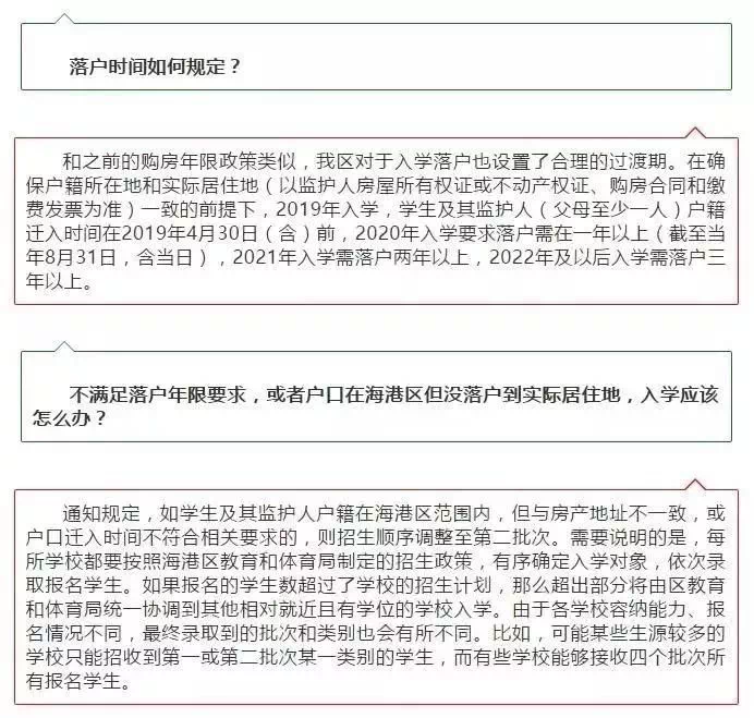 2020年中小学招生入学 学生及其监护人户籍迁入时间需在一年以上(截至当年8月31日,含当日);2021年需落户两年以上;2022年及以后需落户三年以上;如学生及其监护人户籍在海港区范围内,但与房产地址不一致,或户口迁入时间不符合上述要求的,则招生顺序调整至第二批次(具体入学批次以当年招生入学文件为准)。