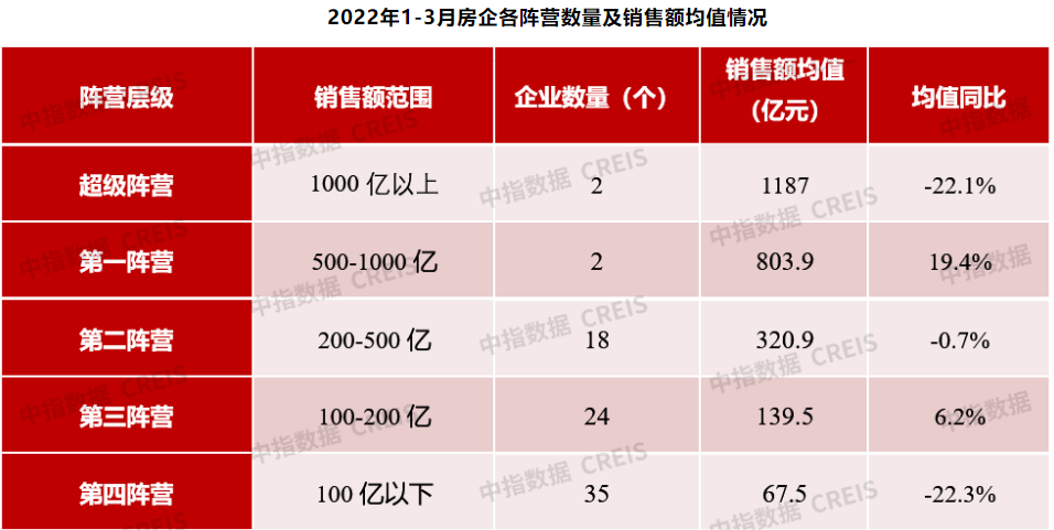 3月31日,中指研究院、克而瑞、亿翰智库等多家研究机构发布了2022年一季度中国房地产企业销售业绩情况。从数据上看,楼市下行压力仍未缓解,整体销售依旧低迷,除了TOP10房企阵营外,其余阵营销售门槛值均同比腰斩。