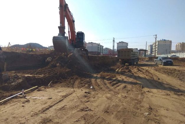 富强路直通碧海路的路基已经形成,刚刚施工完成的热力管网正在用水下澈夯实,大型机械为热力管沟回填土,路基已经开槽。