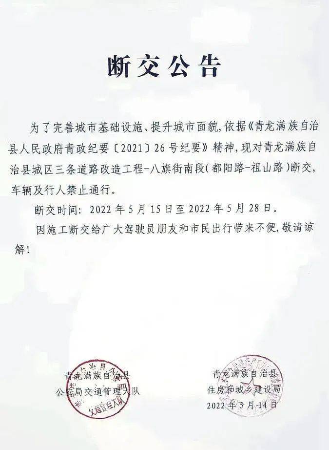 5月15日至28日,青龙满族自治县城区三条道路改造工程——八旗街南段(都阳路——祖山路)断交,车辆及行人禁止通行。