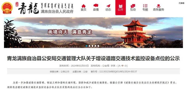 以上道路交通技术监控点位,自发布之日起15日后,于2024年1月18日零时启动抓拍。为保护公民、法人或者其他组织的合法权益,青龙满族自治县公安局交通管理大队提醒广大交通参与者依法出行。