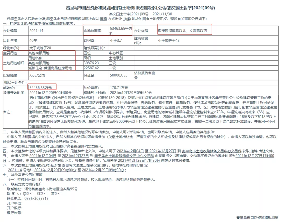 12月29日上午,秦皇岛大酒店二楼会议室土拍现场,位于金梦海湾片区的起始价5.4亿元的2021-14号宗地流拍! 2021-14号宗地 秦交国土告字[2021]09号 2021-14号宗地位于海港区河滨路以北、文育路以西,该地块位于炙手可热的金梦海湾片区。土地面积53463.65平方米,规划用途