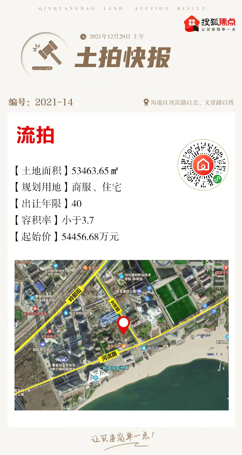 12月29日上午,秦皇岛大酒店二楼会议室土拍现场,位于金梦海湾片区的起始价5.4亿元的2021-14号宗地流拍!