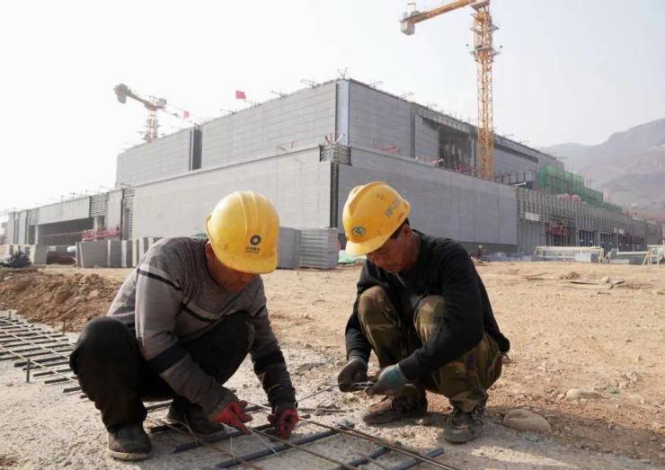 4月2日,工人在山海关中国长城博物馆(暂定名)工地上作业。