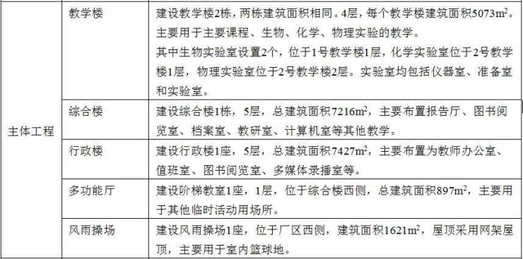 其中,地上建筑16830平方米,包括教学楼、实验楼、综合楼、风雨操场、合班教室、图书室、300米操场、主席台看台、门卫、换热站;