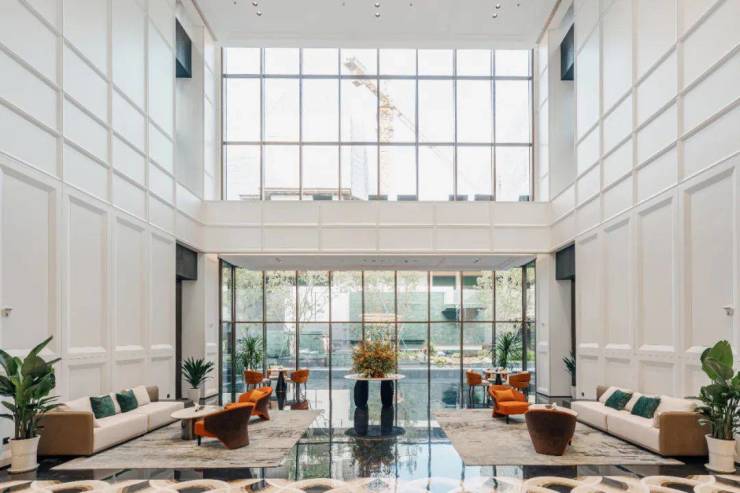 净高4.3米,长180米风雨连廊,让归家“风雨不沾衣”。地面与墙面均采用进口大理石,倒映建筑形成“时空走廊”全时赏景。