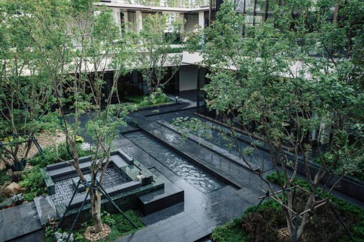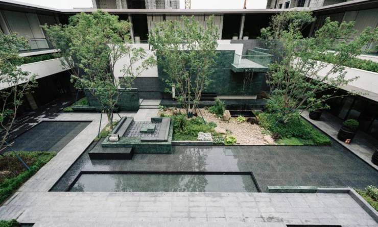 浮岛水院内,六棵60年树龄黄蜡扎根镜水之上;两侧叠水向中央汇聚,形成中式意境里的“四水归堂”意境。