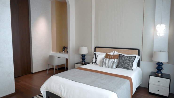 项目采用“奇偶错层"的布局,让所有客厅实现了双层挑空,约6.4-7.4米的奢阔层高,搭配巨幕落地窗与生态露台,豪奢的空间感扑面而来。
