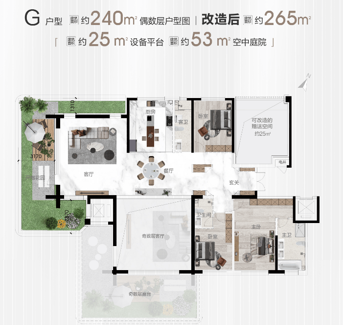 以建面约240㎡户型为例,空中庭院赠送面积53㎡,可改造为卧室书房的设备间赠送面积25㎡,户型实际可使用面积约265㎡,在不计算客厅双层挑高空间的情况下,得房率就已高达110%。