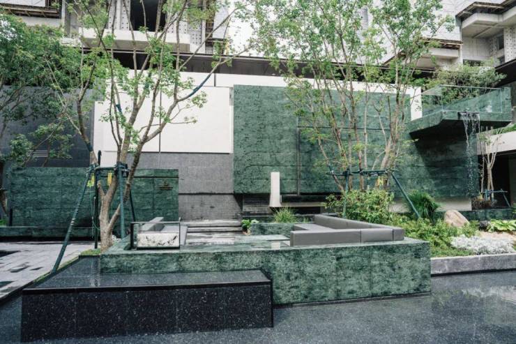 36米长下沉楼梯景墙,采用宝格丽绿奢石、月光米黄大理石与安哥拉黑石分层拼接。叠水瀑布与30年树龄元宝枫营造自然意境,蜿蜒步道分隔水景,增强空间互动感。