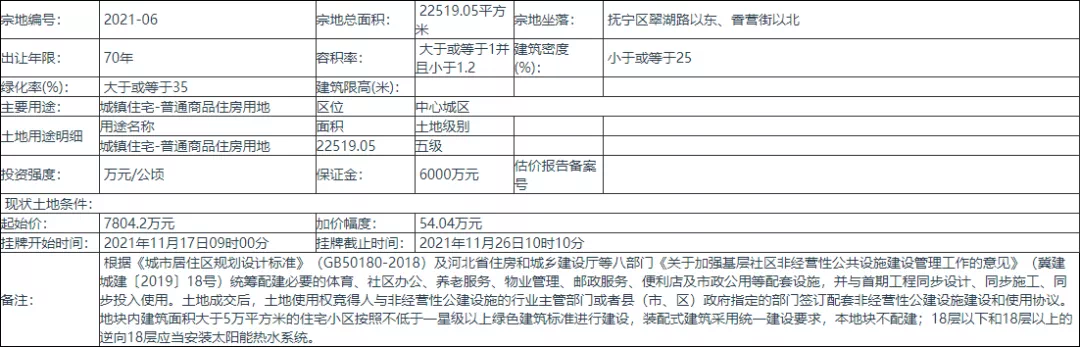 成交土地编号为2021-06,位于抚宁区翠湖路以东、香营街以北,主要用途为城镇住宅-普通商品住房用地。