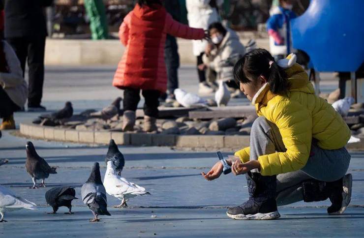 游客在鸽子广场喂食鸽子。郎千硕摄