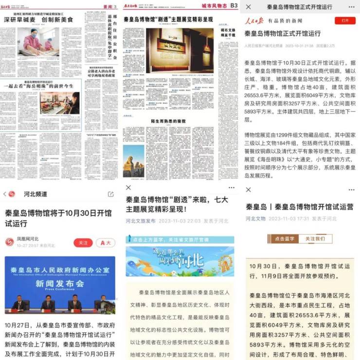 人民日报、长城网、河北日报、秦皇岛日报、秦皇岛电视台等主流媒体累计宣传报道54篇,助推“秦皇岛博物馆开馆”成为全市“现象级”事件,全方位、多层次、多样化向大家展现了秦皇岛博物馆的新馆风貌。