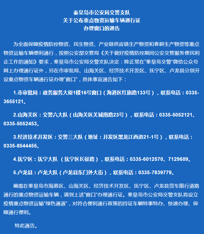 严格落实保障物流畅通促进产业链供应链稳定工作要求,对重点物资运输车辆,实行交管业务“特事特办”,开通专门窗口,积极提供集中办理、上门办理等服务。开设重点物资运输“绿色通道”,严格执行全国统一的通行证制度,协助相关部门对持证货车快速检疫、快速放行,较大限度保障通行便利。