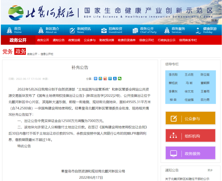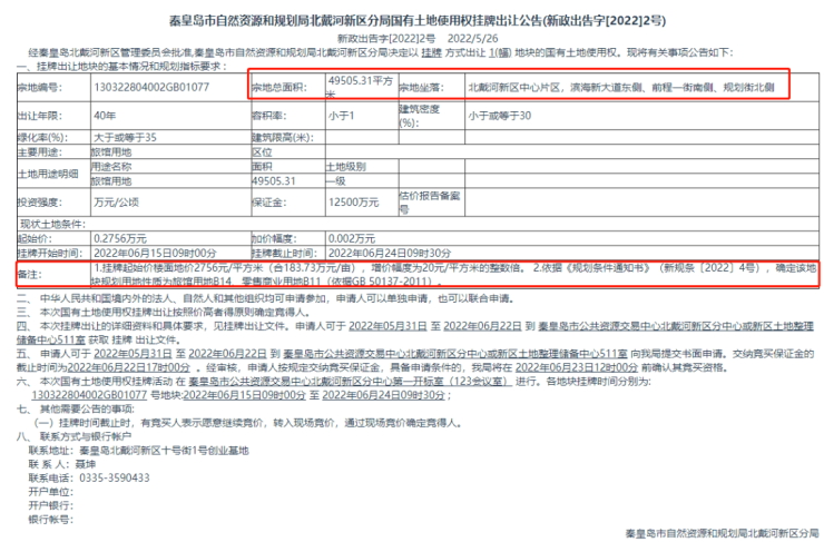 6月17日,秦皇岛市自然资源和规划局北戴河新区分局发布一则补充公告,对2022年5月26日公开挂牌出让位于北戴河新区中心片区,滨海新大道东侧、前程一街南侧、规划街北侧地块,面积49505.31平方米(合74.2580亩)一宗地块信息进行调整。