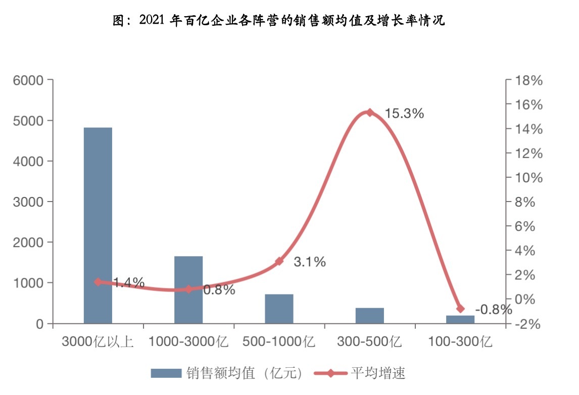 中指研究院企业事业部研究负责人刘水在月度分享会上解读时表示:“2021年行业进入降速求稳通道特征明显,增速分布呈现倒V形;百亿阵营分化加剧,300亿-500亿阵营企业增速较快,其余阵营企业增速较低。”