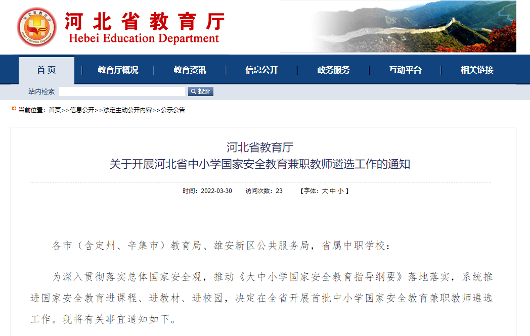 关于开展河北省中小学国家安全教育兼职教师遴选工作的通知