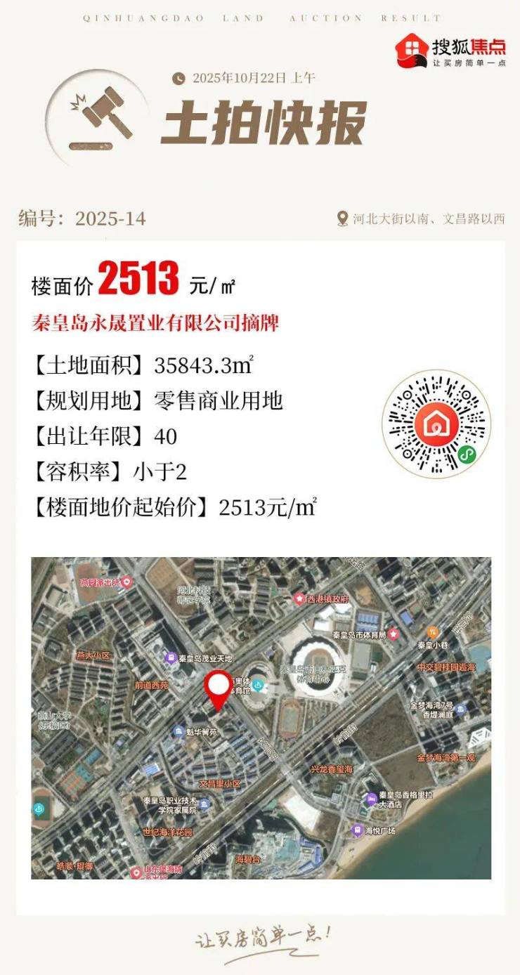 今日,秦皇岛茂业对面商业地块由永晟置业成功摘牌,成交价约1.8亿元,成交楼面价2513元/㎡。