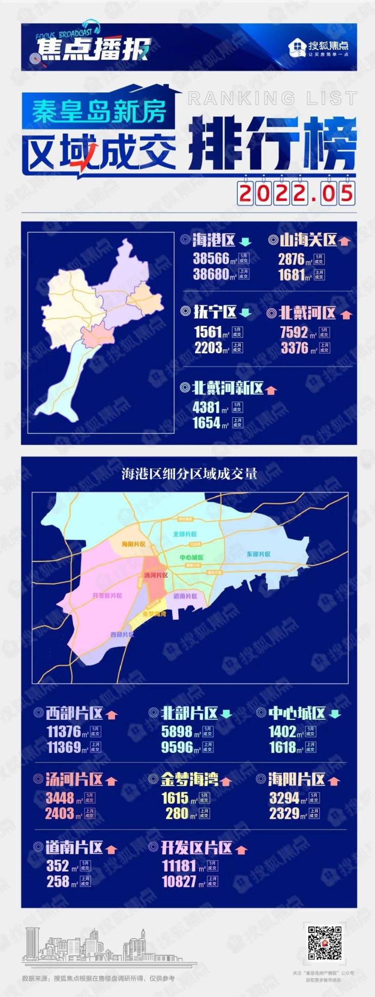 从主城区成交数据看,海港区、抚宁区、北部片区和中心片区5月新房成交面积下降,其余9个片区成交面积均上涨,具体如下图所示: