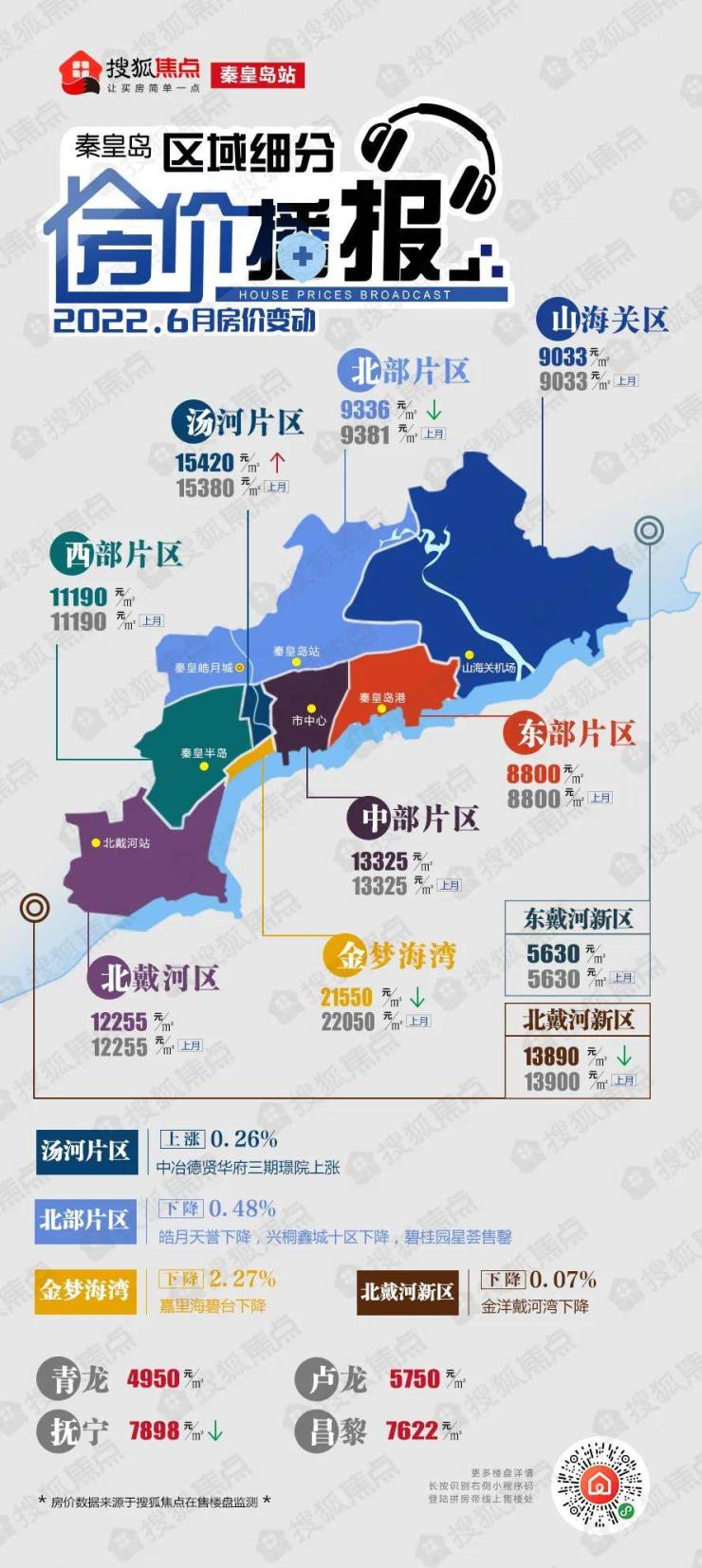 房价下跌幅度较大的区域分别为:金梦海湾片区(均价21550元/㎡)环比下跌2.27%、抚宁区(均价7898元/㎡)环比下跌1.25%。北部片区、北戴河新区的降幅紧随其后。