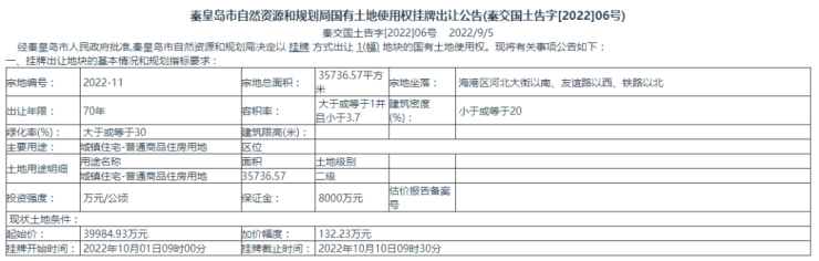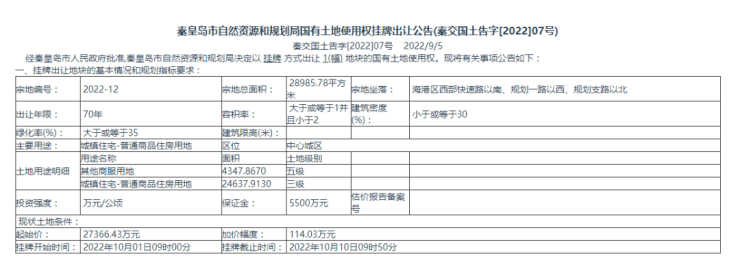 9月5日,中国土地市场网发布秦皇岛市自然资源和规划局国有土地使用权挂牌出让公告(秦交国土告字[2022]07号),经秦皇岛市人民政府批准,秦皇岛市自然资源和规划局决定以挂牌方式出让 1(幅) 地块的国有土地使用权。