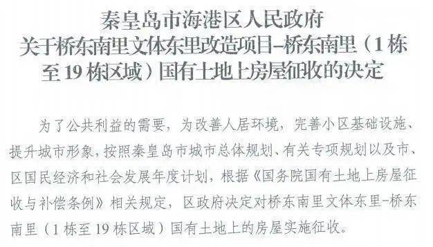 2020年9月底,海港区人民政府发布了关于桥东南里文体东里改造项目—桥东南里(1栋至19栋区域)国有土地上房屋征收的决定。住宅房屋共计546套,建筑面积总计约26601平方米;商业房屋2套,建筑面积总计约1371平方米;下房546间,建筑面积总计约2566平方米;配电室1个、换热站1个及少量其他类型房屋,建筑面积总计约2006平方米。