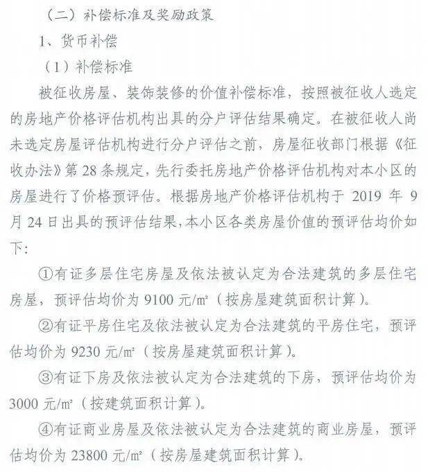 补偿方式包括货币补偿或选择房屋产权调换。其中货币补偿暂定补偿标准:有证多层住宅房屋及已发被认定为合法建筑的多层住宅房屋,按9100元\㎡予以补偿。有证住宅平房及已发被认定为合法建筑的住宅平房,按9230元\㎡予以补偿。有证下房及依法被认定为合法建筑的下房,按3000元\㎡予以补偿。