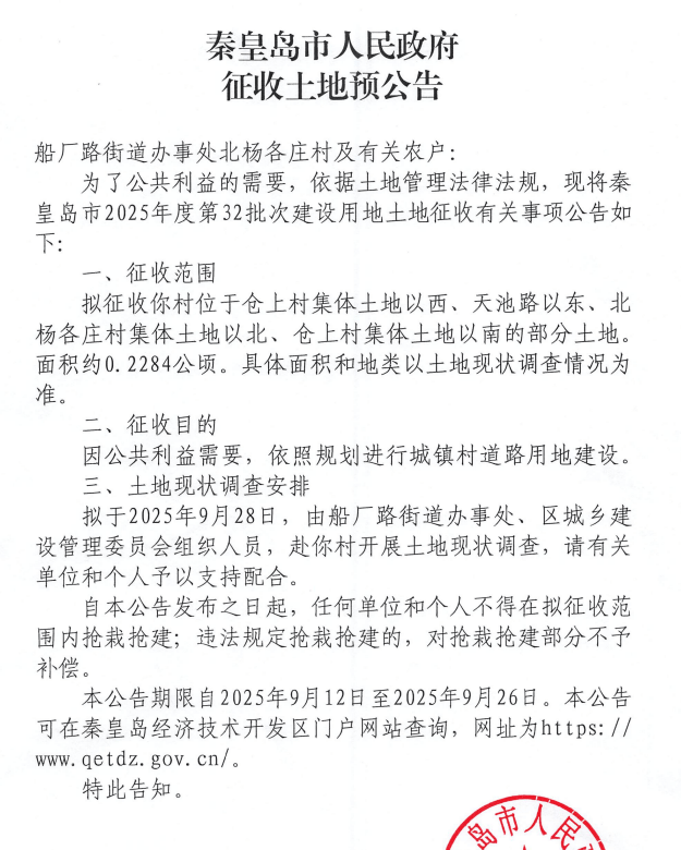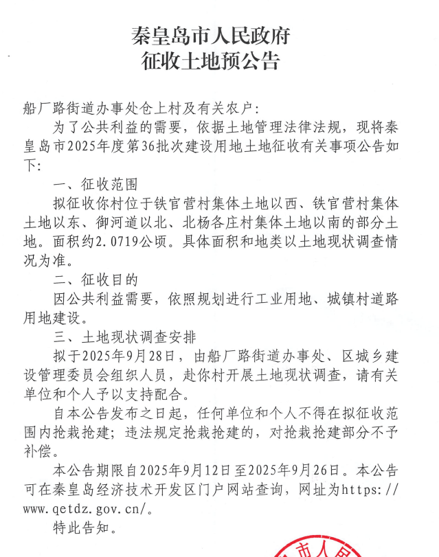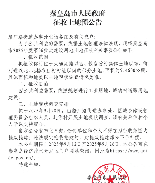 近期,秦皇岛主城区、开发区、昌黎县等多地发布征地预公告,涉及海港区主要商业地段和多个村落,详情如下: