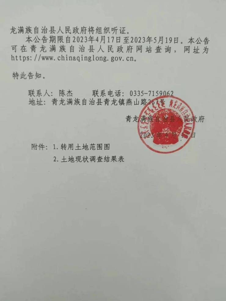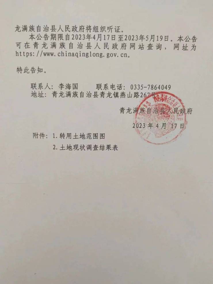青龙县发布转用土地补偿安置公告