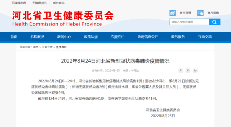 截至8月24日24时,河北省现有确诊病例1例;尚在医学观察无症状感染者41例。