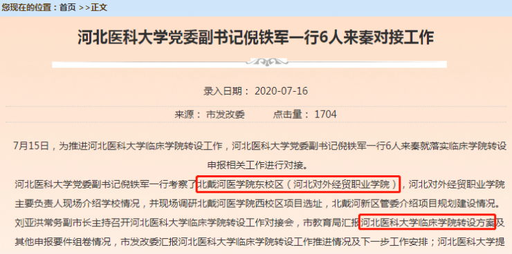 根据协议,河北医科大学临床学院与河北对外经贸职业学院合并转设,转设后新学校位于北戴河生命健康产业创新示范区,暂定名称为北戴河医学院。