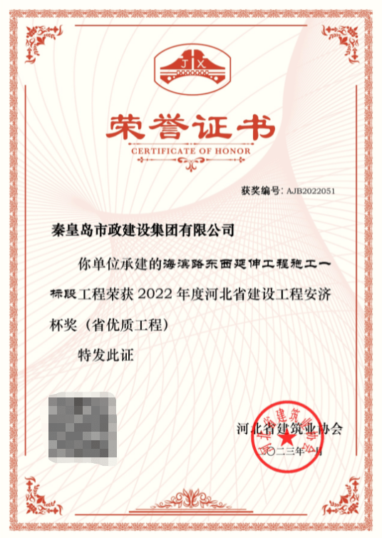 近日,河北省建筑业协会公布2022年度河北省建设工程安济杯奖(省优质工程)获奖工程名单,我公司承建的海滨路东西延伸工程施工一标段工程荣获2022年度河北省建设工程安济杯奖(省优质工程)。