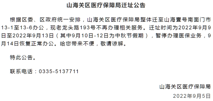 山海关区医疗保障局发布迁址公告。9月9日至9月13日暂停办理医保业务。