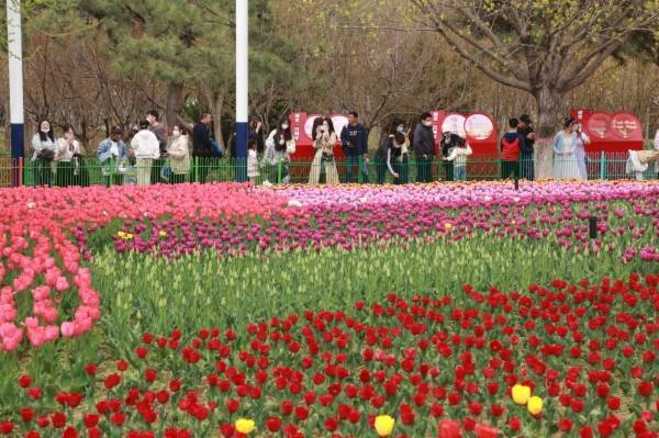 郁金香花海引不少市民前来赏花留念。