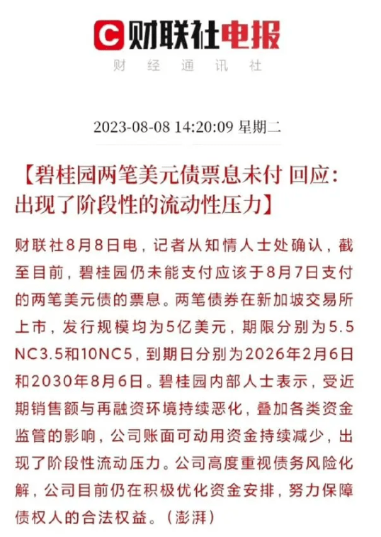 8月8日,市场有消息称:截至目前,碧桂园仍未能支付应该于8月7日支付的两笔美元债的票息。两笔债券的利息均有30天的支付宽限期。