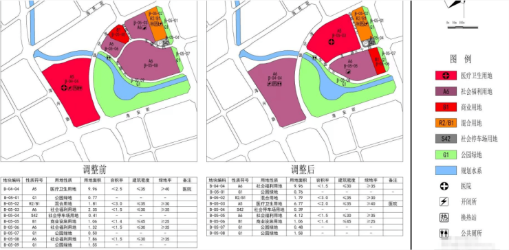 一是将B-04-04地块用地性质由医疗卫生用地调整为社会福利用地,调整后容积率<1.5,建筑密度≤30%,绿地率≥35%。