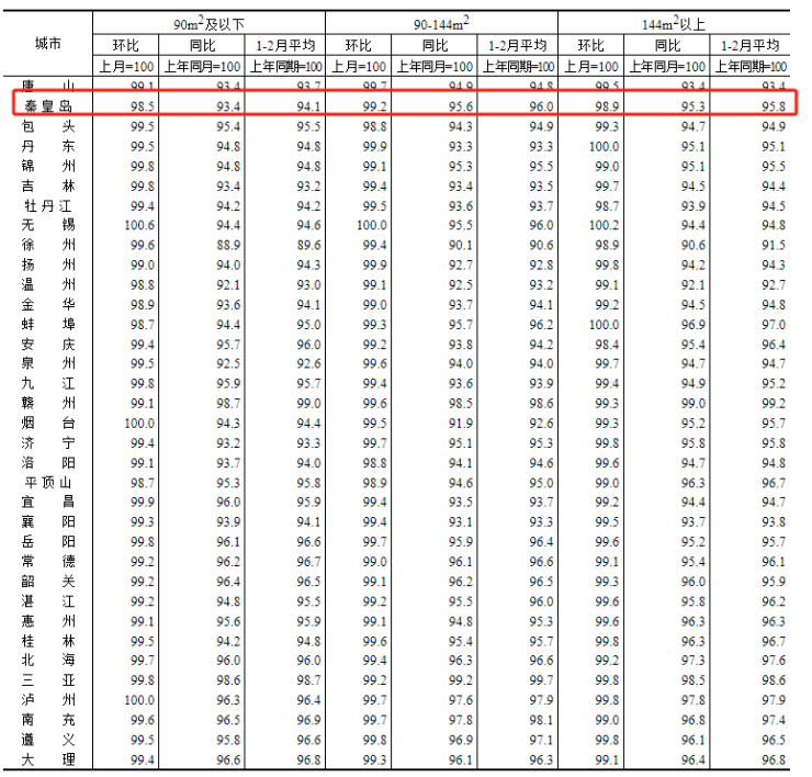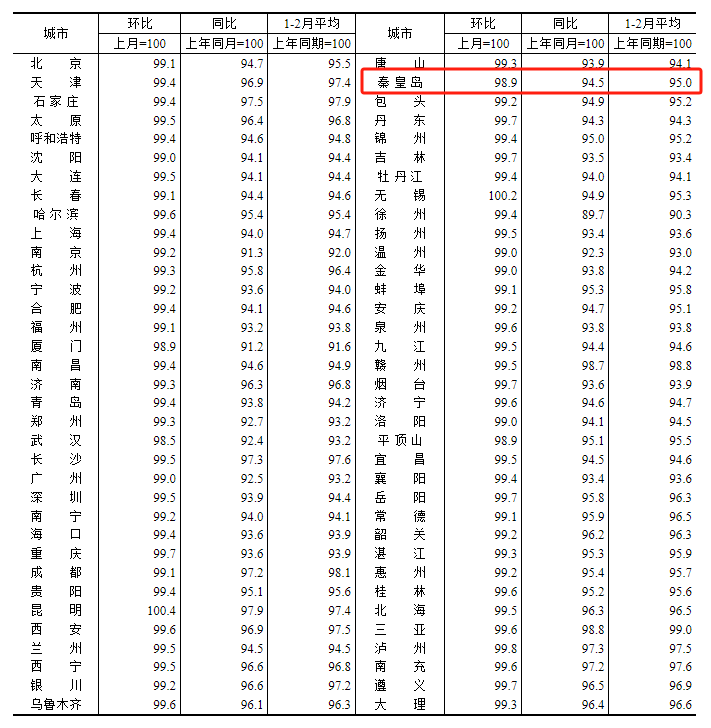 从上述国家统计局发布的数据看,秦皇岛2月份新房、二手房销售价格(网签数据)仍未见起势,环比跌幅与上月持平。