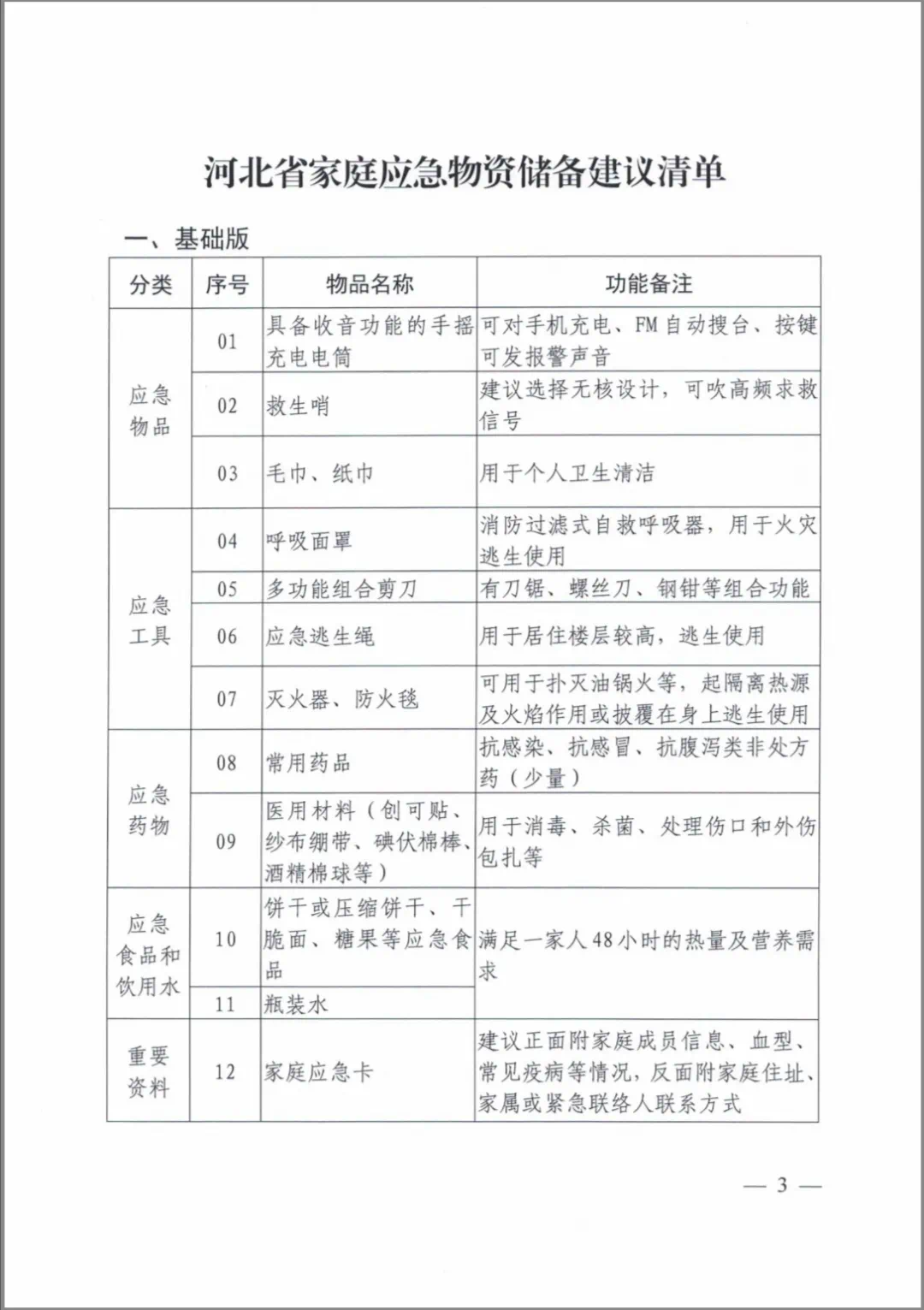 近日,河北省应急管理厅、省卫生健康委员会、省工业和信息化厅共同研究制定了《河北省家庭应急物资储备建议清单》,有条件的家庭可以根据清单储备必要的应急物资,进一步强化全社会防灾减灾救灾意识。