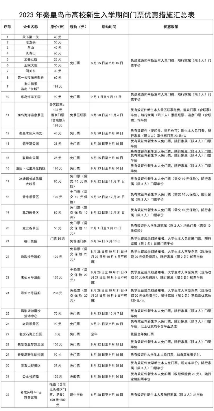 据介绍,在8月底至9月期间,天下第一关景区、老龙头景区、角山景区等我市30余家景区推出针对大学新生免票入园,陪同家长享受半价等优惠政策。(具体优惠见表格)