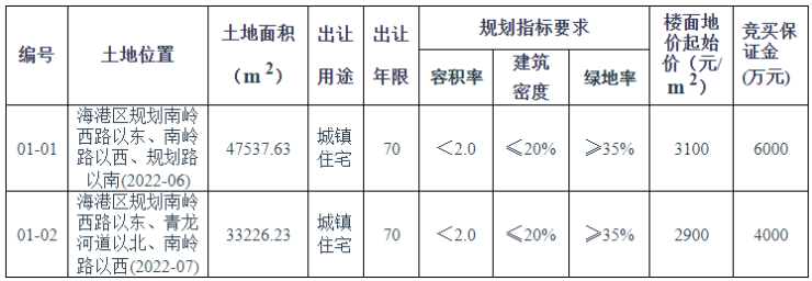 编号01-01地块,位于海港区规划南岭西路以东、南岭路以西、规划路以南(2022-06),土地面积47537.63㎡,出让用途为城镇住宅,出让年限70年,容积率<2.0,绿地率≥35%,建筑密度≤20%,楼面地价起始价3100元/㎡,竞买保证金6000万元。