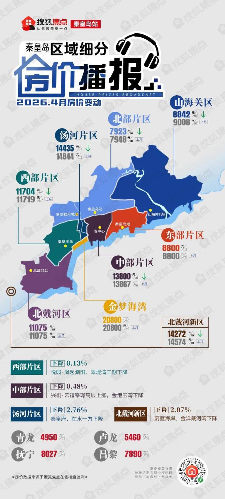 北戴河新区(均价14272元/㎡)环比下跌2.07%