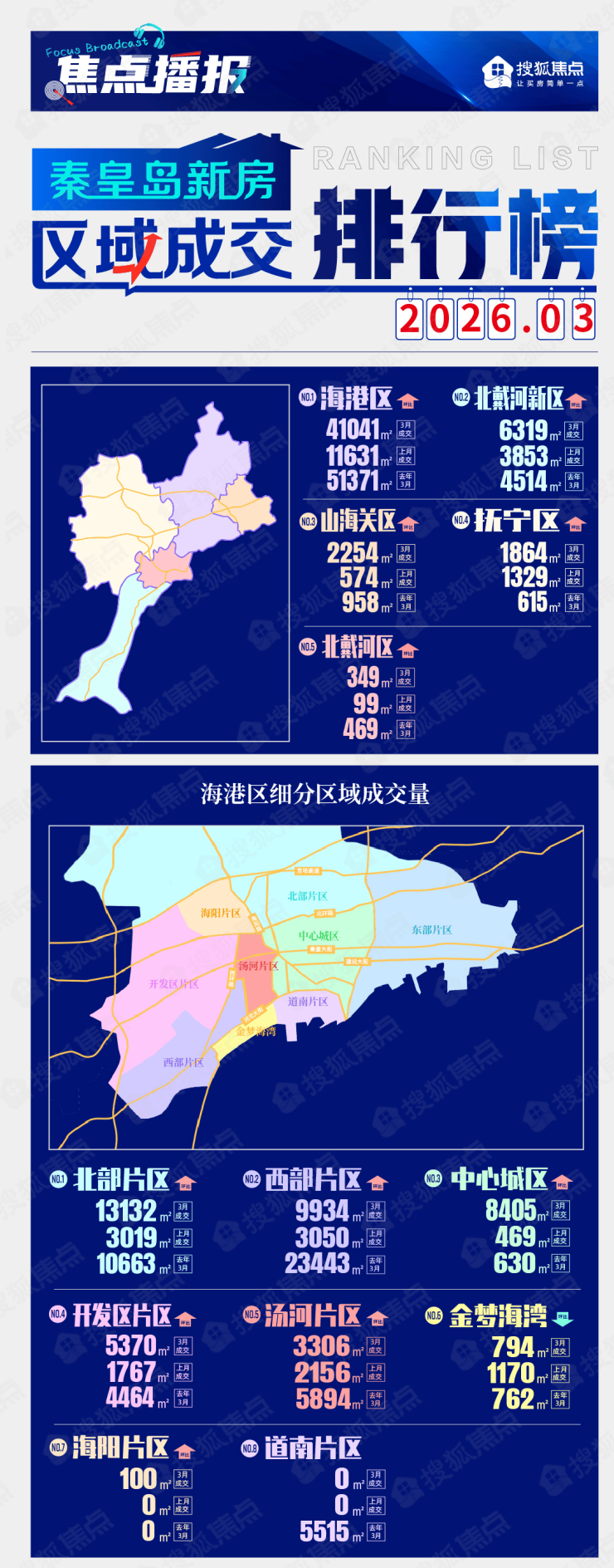 3月份,秦皇岛房地产市场5大区域(含北戴河新区),海港区、山海关区新房成交面积环比大涨,5大区域环比均上涨。