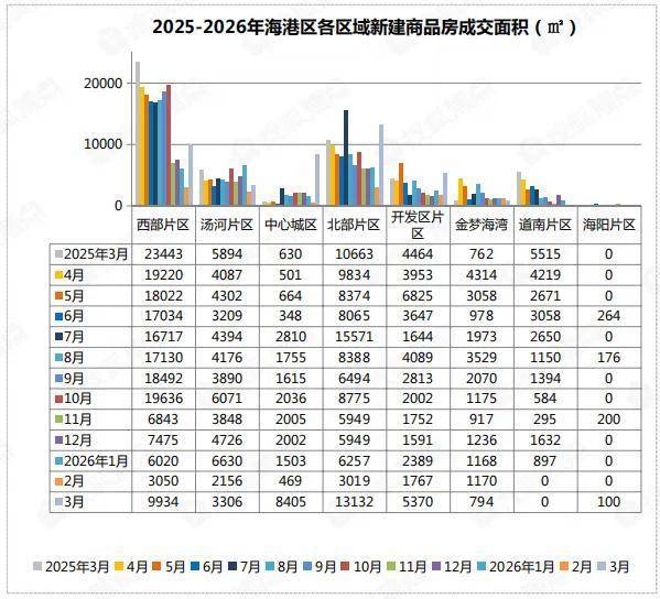 3月海港区8大片区新建商品房成交面积仅金梦海湾环比下跌,6个区域全线上涨。详情如下: