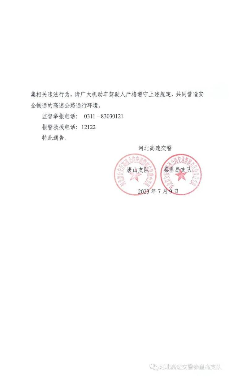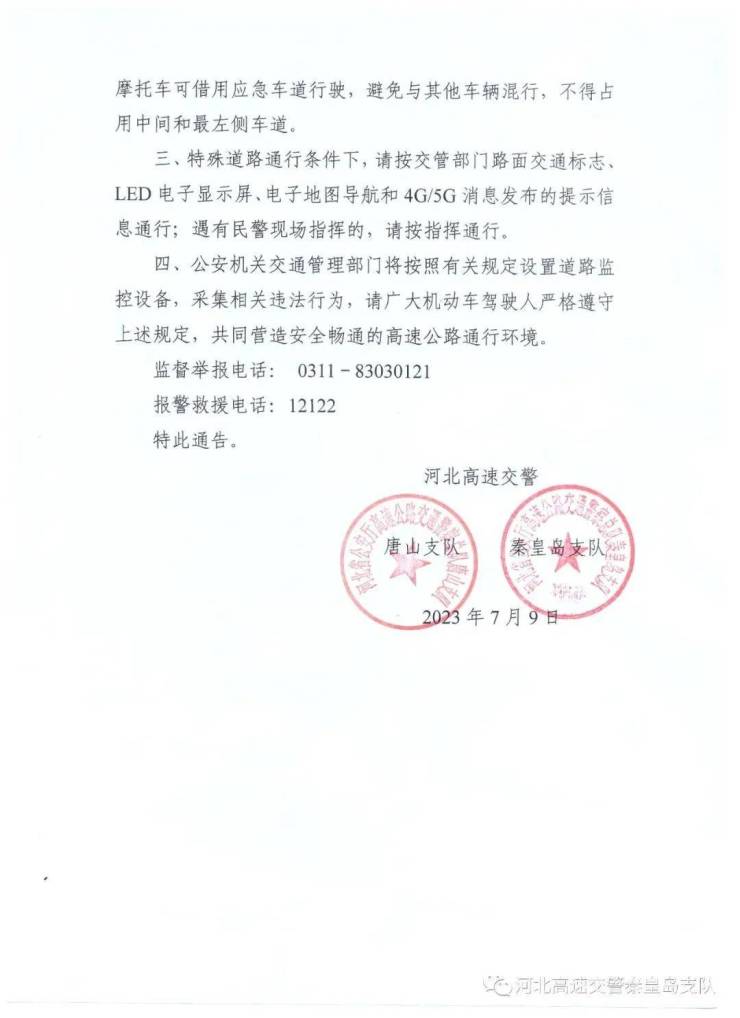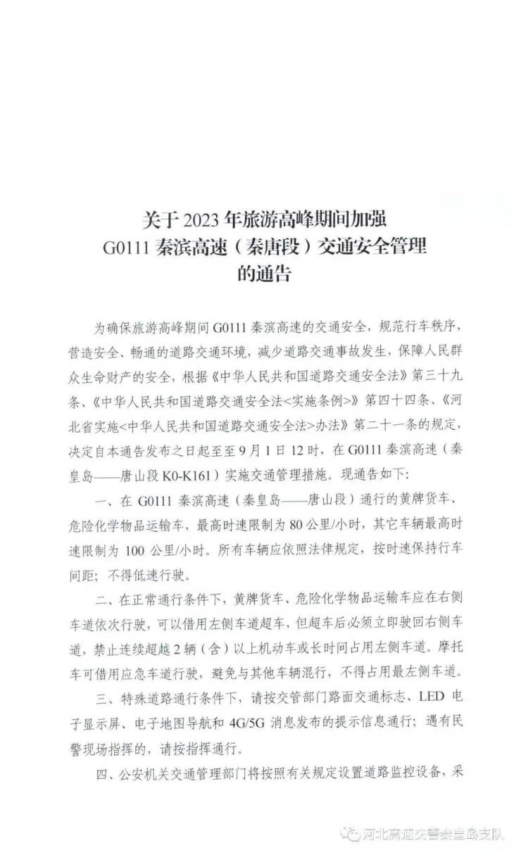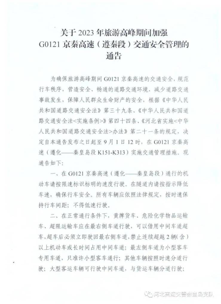 7月9日,河北高速交警秦皇岛支队微信公众号刊发两则通告,即“关于2023年旅游高峰期间加强G0121京秦高速(遵秦段)交通安全管理的通告”“关于2023年旅游高峰期间加强G0111秦滨高速(秦唐段)交通安全管理的通告”,详情如下: