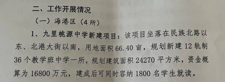 对于九里桃源中学何时动工、何时投入使用等问题,海港区住建局相关工作人员表示:九里桃源中学的土地正在征转中,具体方案还未确定。