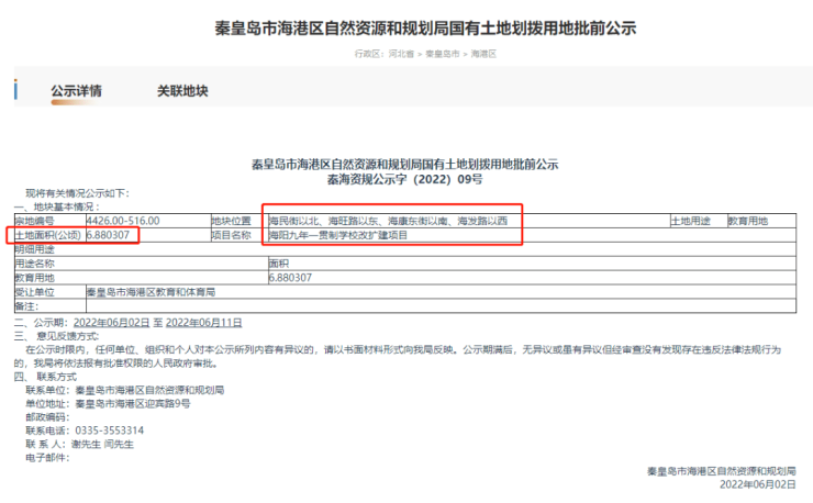 6月2日,海港区自然资源和规划局国有土地发布一则划拨用地批前公示,一宗位于海港区海阳片区的教育用地由秦皇岛市海港区教育和体育局受让,土地面积为6.880307公顷,项目名称为海阳九年一贯制学校改扩建项目。