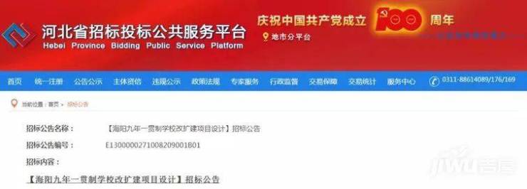 去年11月,河北省招标投标公共服务平台发布【海阳九年一贯制学校改扩建项目设计】招标公告,公告显示海阳九年一贯制学校改扩建项目设计已获批准建设,项目总占地面积103.21亩,总建筑面积40369平方米。