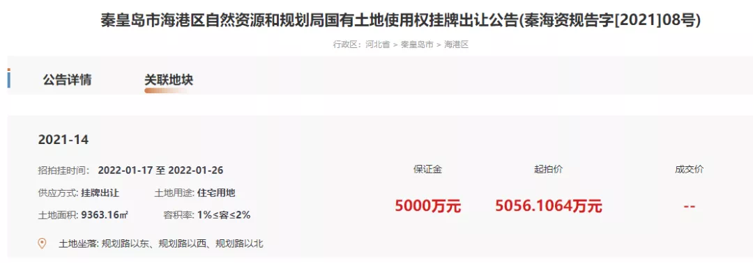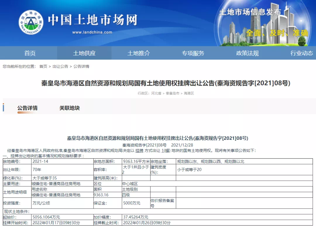 起拍价0.5亿元!秦皇岛海港区较新挂牌出让一宗商住地块